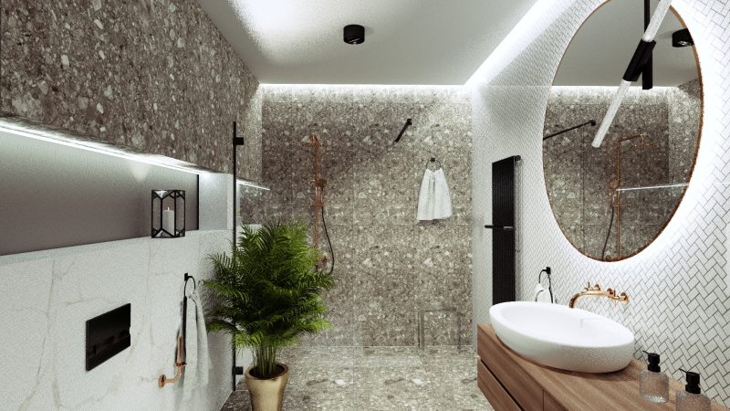 - projekt łazienki –widoki ścian,podłogi, ilość m2, zestawienie wyposażenia;